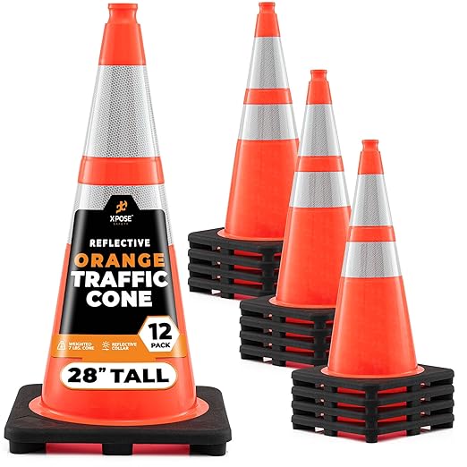 Xpose Safety 28 Inch Orange Traffic Cones with 6" & 4" Collars, 12-Pack - Multipurpose PVC Plastic Safety Cone for Parking, Soccer, Caution, Kids and Construction - DOT Approved
