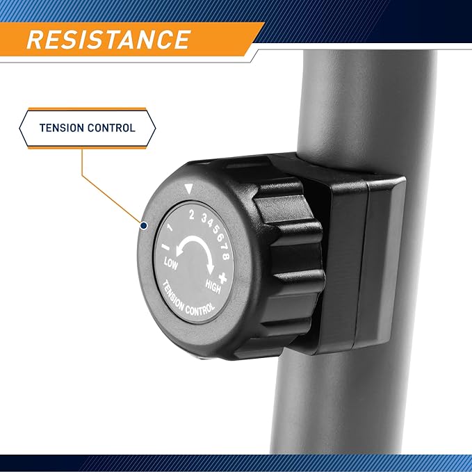 - EIGHT RESISTANCE LEVELS – This stationary bike uses a magnetic resistance mechanism with 8 levels of resistance. The tension knobs control the difficulty to simulate riding on different terrains and customize your workout according to fitness level