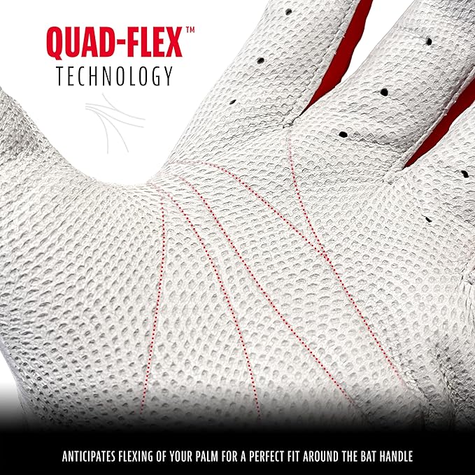 - QUAD-FLEX TECHNOLOGY: Anticipates flexing of your palm for a perfect fit around the bat handle