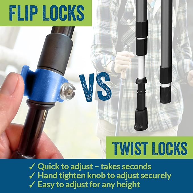 - ADJUSTABLE & COLLAPSIBLE: Telescoping poles adjust from 32" to 54" using new exclusive flip lock - better than twist locks. Perfect for walkers and hikers. Fits heights from 5'4" to 6'2"