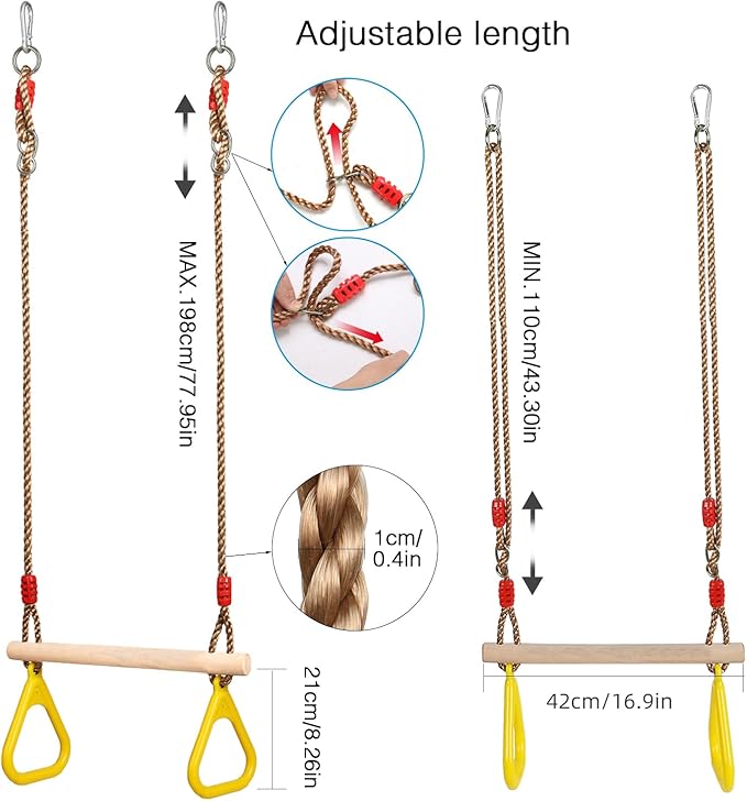 - ๐๐๐๐๐๐๐ ๐๐๐๐๐ ๐๐๐๐- Strong wood loadable up to 352LB/ 160KG, with the super wear-resistant and sturdy PP ropes (up to 10 mm in diameter), Wooden Swing Bar: 16.54inche/42cm in length and 1.18inche/3cm in diameter.