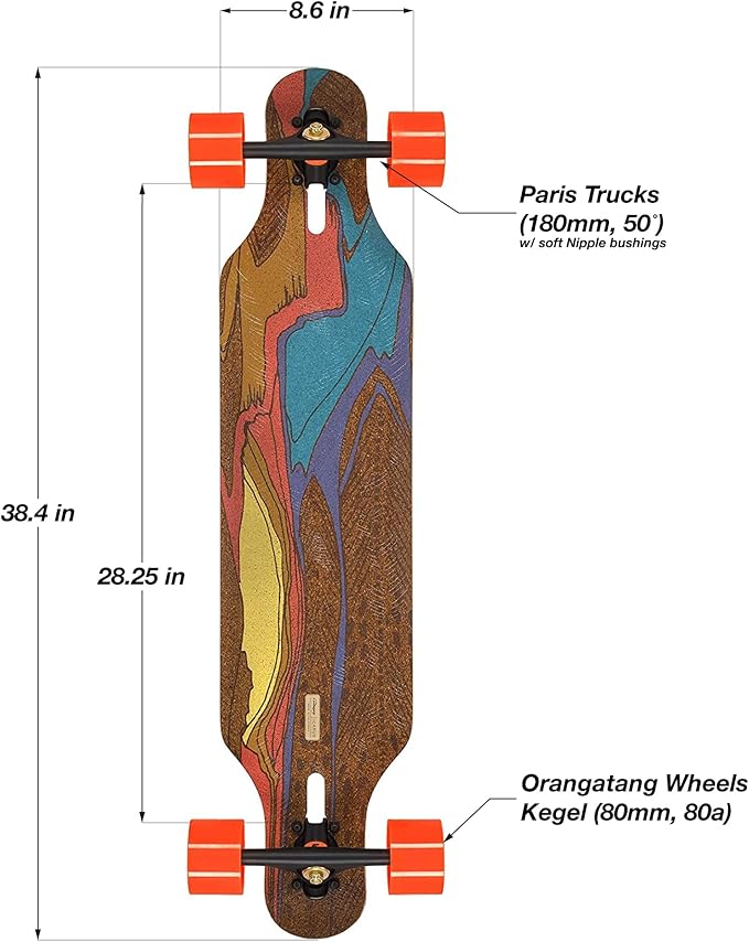 - PREMIUM COMPONENTS – Paris 180mm 50° trucks with upgraded Orangatang Nipples (soft/orange) bushings deliver smooth and agile turning with extra lively and energetic carving performance. Orangatang 80mm 80a Kegel wheels provide unmatched roll speed, grip, and smoothness. Includes Loaded Jehu V2 bearings.