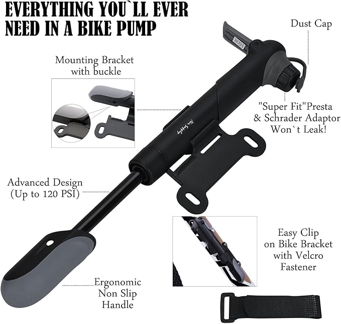 - High-Pressure Mini Pump & Essential Repair Tools - The bike tire repair kit comes with a 120 PSI mini bike pump that supports both Presta and Schrader valves, ensuring you're always ready to inflate your tires. This bike kit also includes tire levers, glueless tire tube patches, and a metal rasp - everything you need for quick and easy tire repairs, so you can cycle with confidence