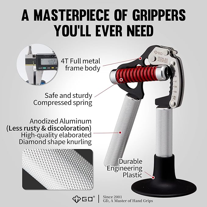 - [Incredible build quality] Made with aluminum handles, strong compressing springs, and 4T iron; GD Iron grip is sturdy as a tank. GD aims for high quality and perfect craftsmanship. This durable and safe hand strengthener is the only grip strength trainer you will ever need.