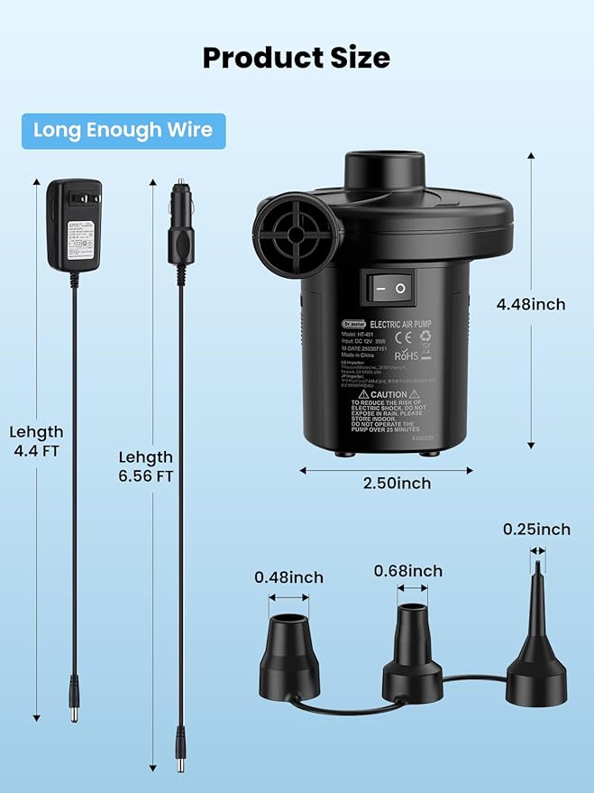 - 3 VERSATILE NOZZLES: Dr.meter Air Pump comes with 3 interchangeable nozzles (S: 0.25", M: 0.68", L: 0.84") to fit most inflatables on the market, ensuring you’re ready for any adventure—camping, beach trips, or backyard lounging.