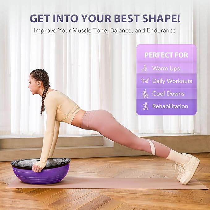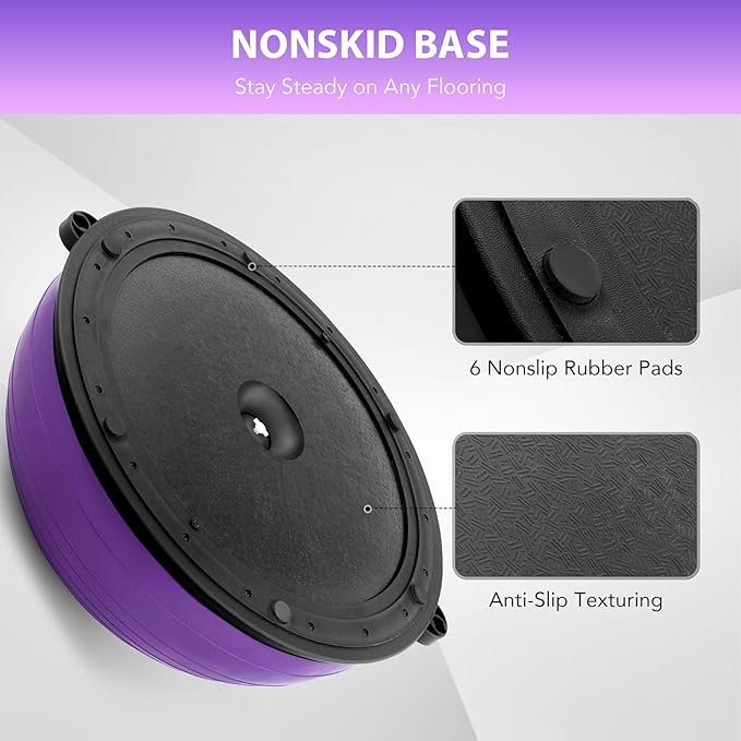 - BALL PUMP INCLUDED: A complete combo, this half-dome stability ball comes with a complimentary foot pump that makes it easy to get fully inflated to 9.8β in under 5 minutes. The ballβs high-quality air valve prevents air leakage and extends service life.