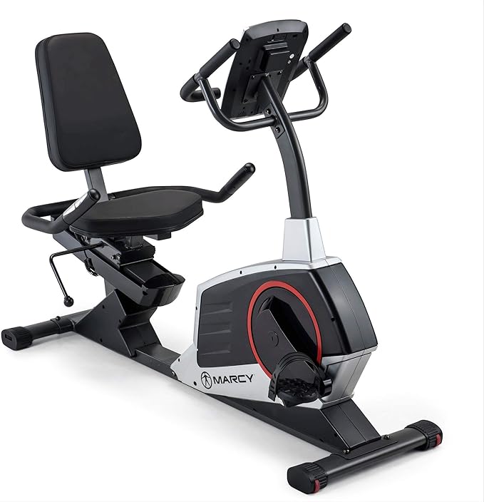 Marcy Regenerating Recumbent Exercise Bike with Adjustable Seat, Pulse Monitor and Transport Wheels ME-706