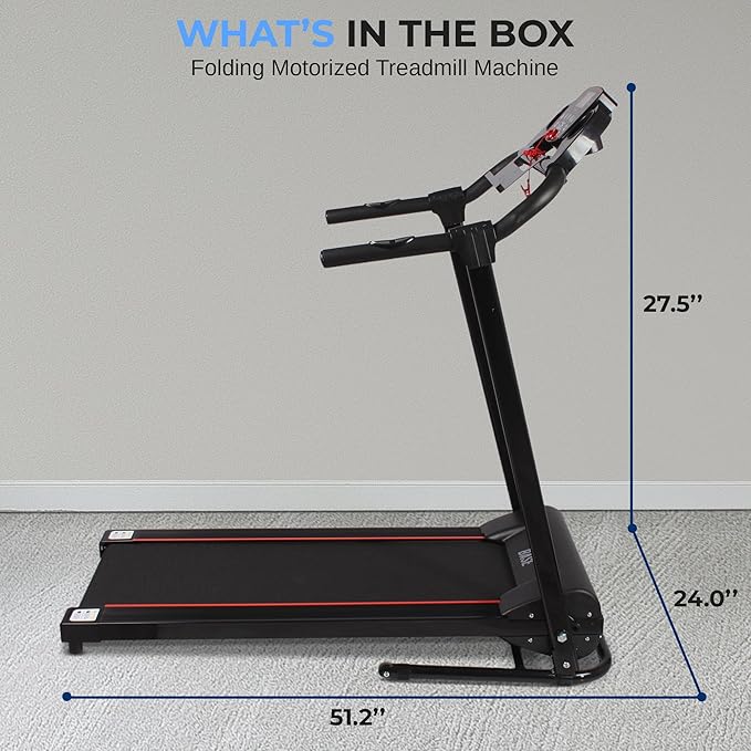 - Safe To Use: Stay Safe & Get An Effective Workout With This Foldable Treadmill. It Comes With Integrated Safety Key & Emergency Shut-Off Button To Cut Power Instantly. Perfect For Jogging, Walking, Running & Cardio Workout At Home. Total Folded Dimensions (L X W X H)- 49.6 X 24.0 X51.2 Inches