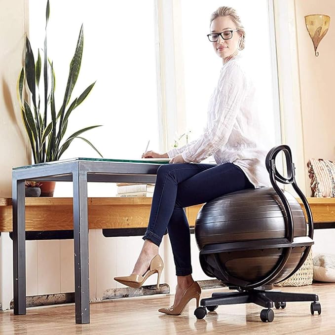 - INCLUDES: Removable 52-centimeter exercise ball, an easy-inflation air pump, 5 easy-glide lockable casters and a desktop guide that illustrates multiple stretching and strengthening exercises to help you stay active