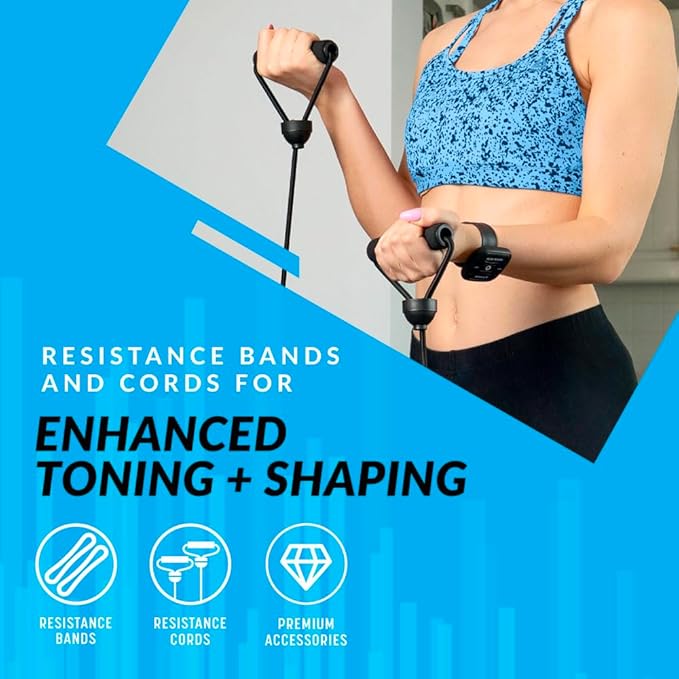 - FULLY LOADED HOME FITNESS PACKAGE - Booming Bluetooth speakers, resistance cables for full body workout options and a sweat-resistant ergonomic remote control.