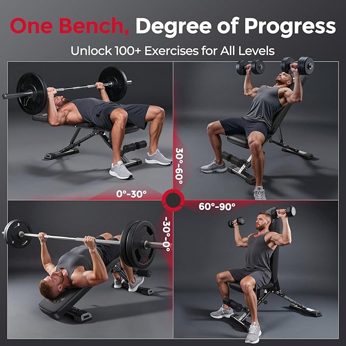 - 144 Adjustable Positions for Full-Body Training: With a range from -30° to 90° (flat/incline/decline/upright), this workout bench enables effective exercise for every major muscle group from chest and shoulders to core; The -10° decline offers a gentle intro to decline bench press lifting; Perfect 90° upright lock for shoulder & arm isolation