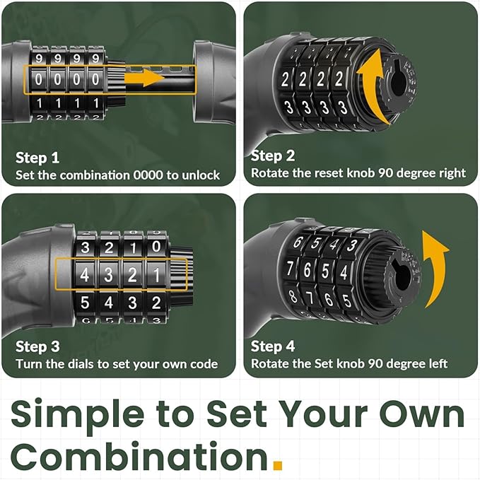 - Resettable combination bike lock: Smart 4-digit resettable coiling lock, easy to set your own personalized combinations. As a kind of combination lock, it saves you a lots of unnecessary troubles, like carrying the keys all the time.