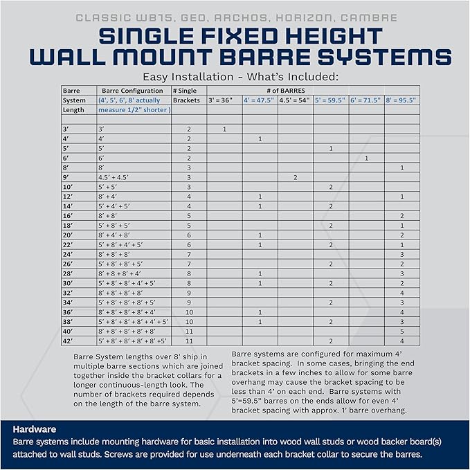 - PROFESSIONAL GRADE - Our premium-quality products are crafted to meet the highest standards in the industry with durable materials like steel, aluminum, and real wood. Our Barres are stable and built to last with a powder-coated finish and Sure Grip rubber feet to withstand years of future workouts and ballet practice. Barres are cut ½” shorter than the stated length: 4’ = 47.5”, 5’=59.5”, 6’=71.5”,7’=83.5”, 8’=95.5”.