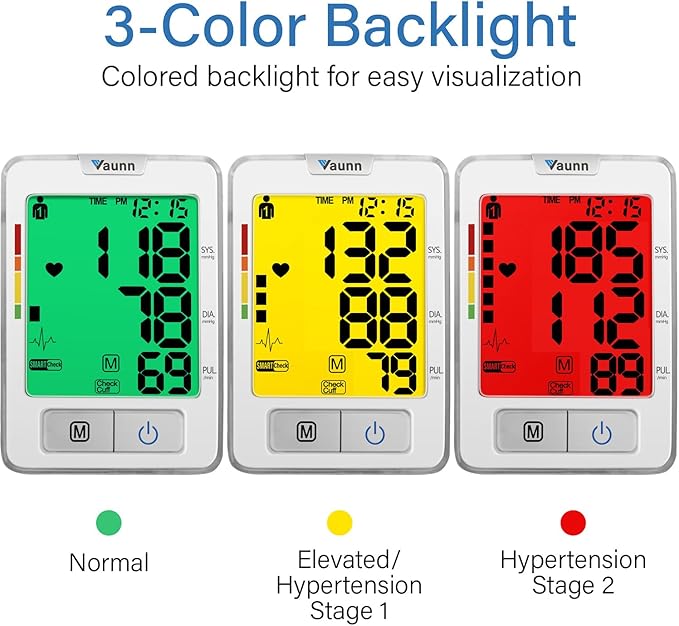 - TRAFFIC LIGHT BAR INDICATOR AND 3-COLOR BACKLIGHT - Classifies blood pressure machine readings into easy-to-read color levels per the latest American Heart Association (AHA) guidelines. Comes with a multi-color backlight, providing a quick and convenient visualization that indicates if your blood pressure is too high.