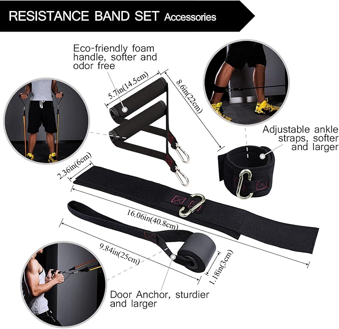 - Get your complete resistance bands set now: You’ll feel 100% satisfaction from the moment you received the exercise bands set. They come with a lightweight carrying bag, a sturdy door anchor, a pair of larger straps and handles for home gym exercise, door exercise, weightlifting, stretch exercise,leg exercise, etc. We are quite sure that you will be super-impressed with the durability, portability, versatility and high quality of our resistance exercise bands.