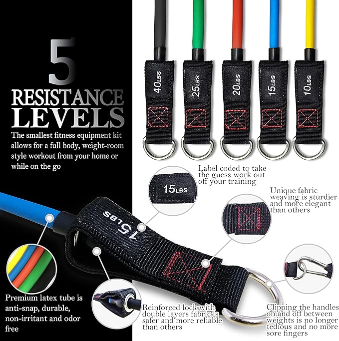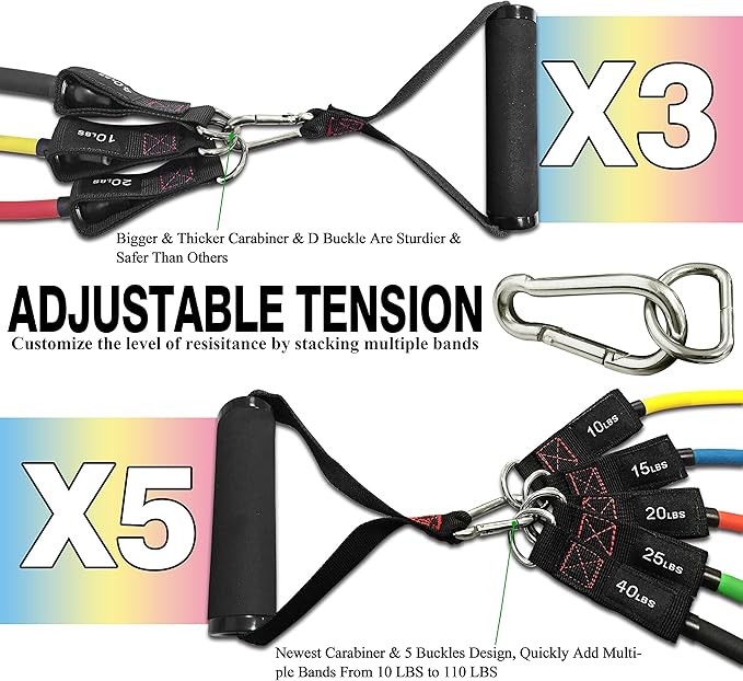 - Versatility, make fitness simple: While free weights(barbells, dumbbells, kettlebells) have long been a fixture in gyms and weight machines are stable and easy to use, neither has the versatility of the resistance bands. 5 bands can be used alone or stacked in any combination of intensity from 10lbs to 110lbs. With attachable handles, ankle straps, door anchor, you can choose different training methods for building strength.