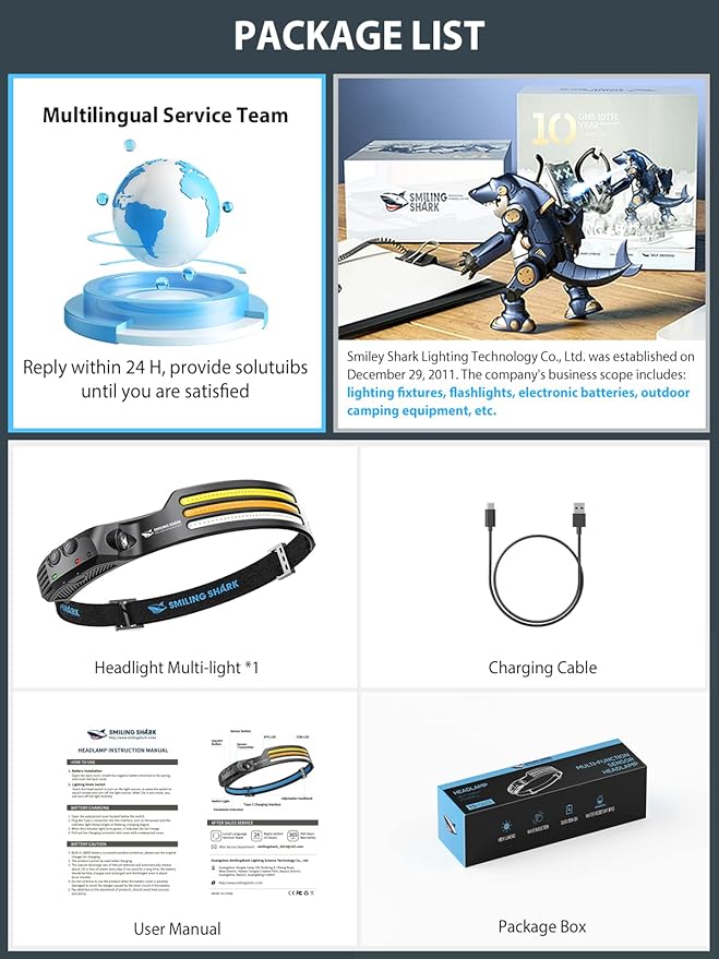 Smiling Shark LED Headlamp, 230°Wide Angle 3*Multi-Color Light Strips The Brightest Head Lamp Rechargeable with Motion Sensor Waterproof Headlight for Camping Hiking Outdoor, Head-Lamp-LED-Hat-Light