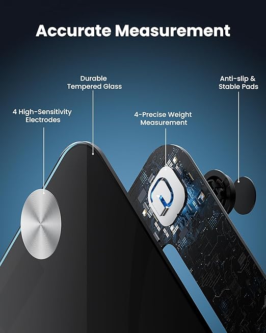 - Intelligent Design: The scale for body weight has automatic calibration. The design of 5 mm tempered glass and 4 high-precision sensors makes the scale become an electronic digital smart body composition analyzer to ensure the accuracy of the data