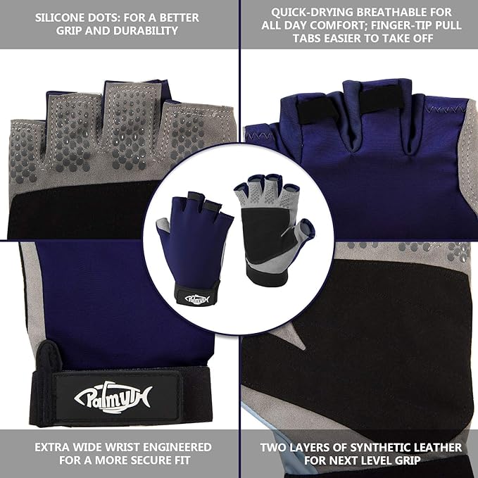 - Full synthetic leather palm and non-slip print dots reinforced palm for a better grip and durability: Extra layer of synthetic leather in palm to gain the better grip on the fishing rods, paddles or trekking poles, and our kayaking gloves help cushion your hands as you row, allowing kayaking trip for maximum fun.