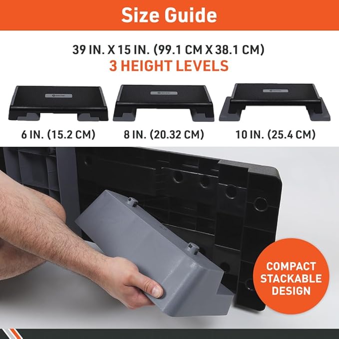 - ADJUSTABILITY. The 39 in. x 15 in. Body Sport Aerobic Step allows users to adjust the height of the platform to 6 in., 8 in., and 10 in. heights for varying levels of difficulty