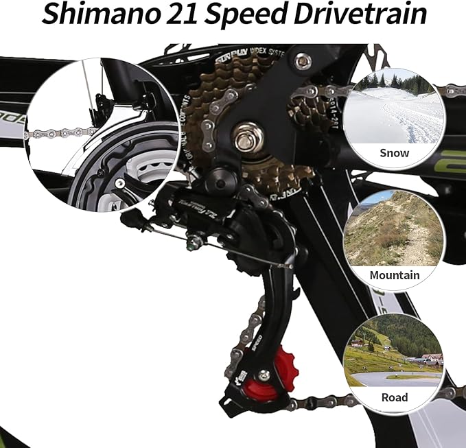 - 【21 Speed Professional Mountain Bike】Shimano shifters combines with the rear Shimano derailleurs to deliver gear changes easy and smooth, for uphill Climbing, downhill riding, or pure acceleration, to keep you pushing through any terrain in your pathShimano 3*7 shifter makes the speed change smoother