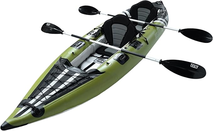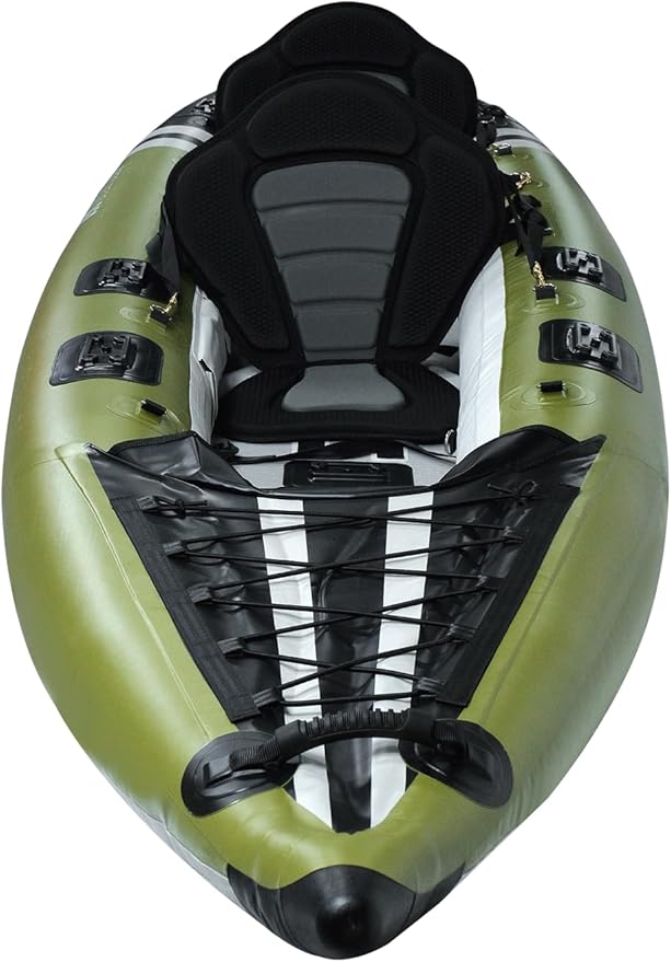 - INCLUDED - PVC inflatable fishing boat Kayak Fishing Boat, 2 x Lightweight Breakdown Kayak Paddles, Removable Skeg, Travel Bag with Backpack Straps, 2 x Padded High Back Support Adjustable EVA Seats, 2 x Drop-In Adjustable Foot Rest and a Dual Action High Volume / High Pressure Hand Air Pump.