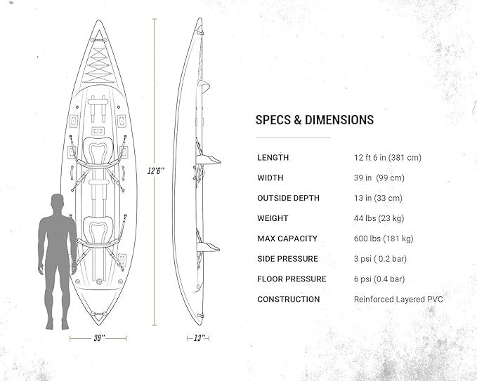 - DIMENSIONS & SPECS - Hull Dimensions: 12' 6" x 3' 3", Hull Weight: 44lbs, Load Capacity: 600lbs, Rigid Dropstitch Floor, Front Bow Spray Shield, 7 x Hard Mounting Points, Halkey Roberts Locking Valves, Ample Bow/Stern Storage and Side Carry Handles