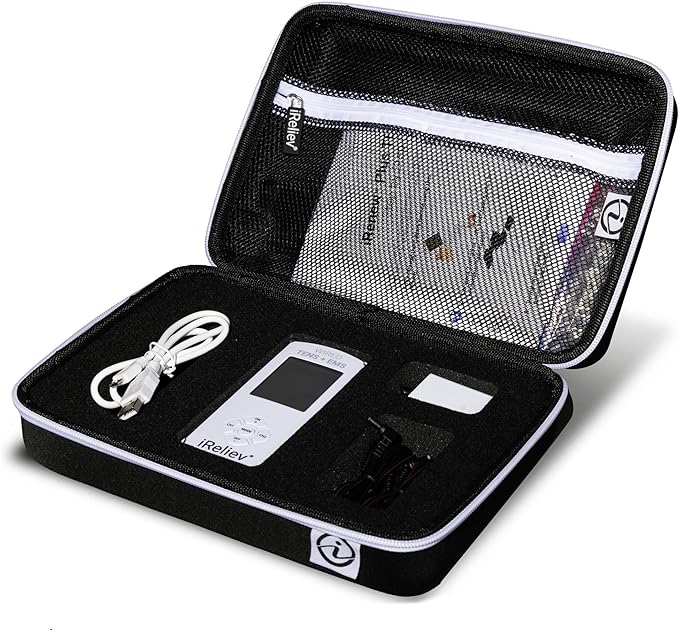 FDA Cleared iReliev TENS Unit + EMS 14 Therapy Modes, Premium Pain Relief and Recovery System, Rechargeable, Large Back Lit Display, 12 Electrodes & Case