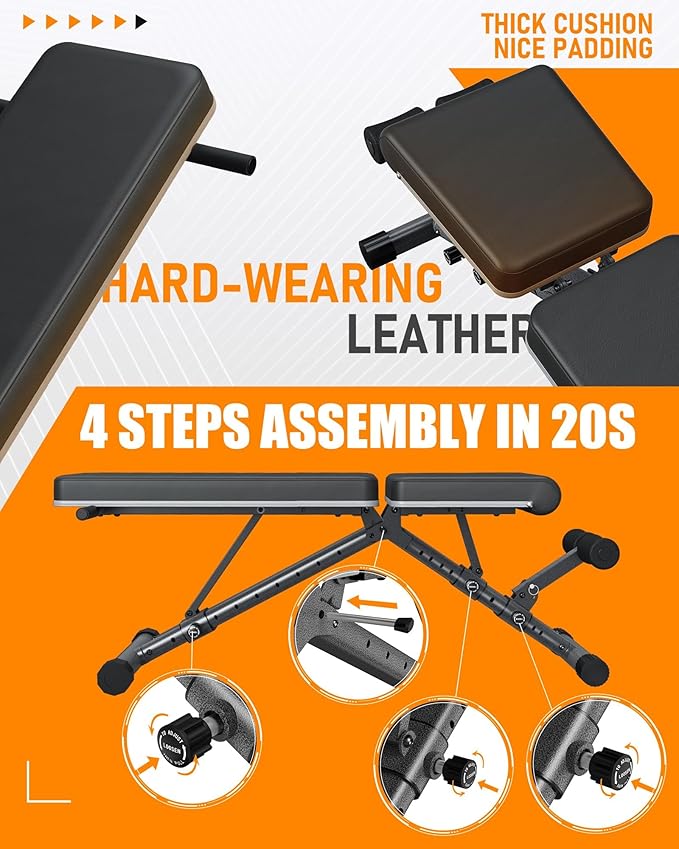- [Dual-Locking Spring Adjustment with One-Second Release] This adjustable weight bench features a dual-locking spring-loaded mechanism that releases in one second and locks securely with a right turn. Unlike cumbersome adjustment systems on typical adjustable weight benches, simply pull the spring lock lightly to adjust the backrest or seat position. Release and turn right once to complete the setting. The dual-lock prevents accidental shifting or resetting during exercises such as incline bench press, sit up bench.The one-touch self-resetting spring lock allows quick adjustment to multiple incline angles to suit various training needs. The reinforced locking mechanism Lock positioning.
