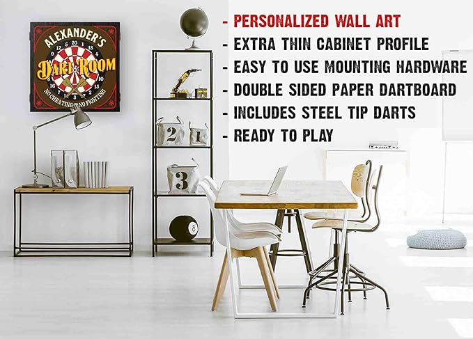 - PERSONALIZED Man Cave Decor & Game Set – Add your name, favorite phrase and special year to create a one-of-a-kind dartboard cabinet that doubles as functional wall decor for your mancave, home bar, games room or garage wall.