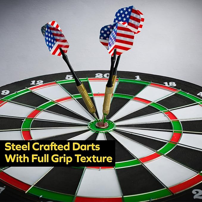 - Complete ALL IN ONE Set – Includes a paper dartboard, 6 steel tip starter darts, built-in scoreboards, chalk, eraser, all the required hanging hardware and instructions – everything you need for endless games with friends and family.