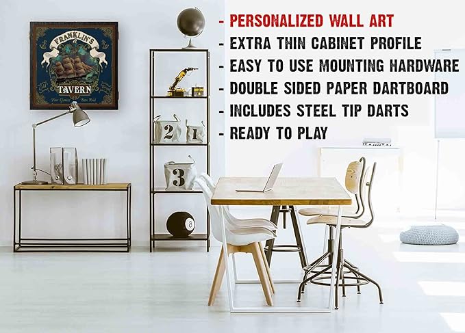 - PERSONALIZED Man Cave Decor & Game Set – Add your name, favorite phrase and special year to create a one-of-a-kind dartboard cabinet that doubles as functional wall decor for your mancave, home bar, games room or garage wall.