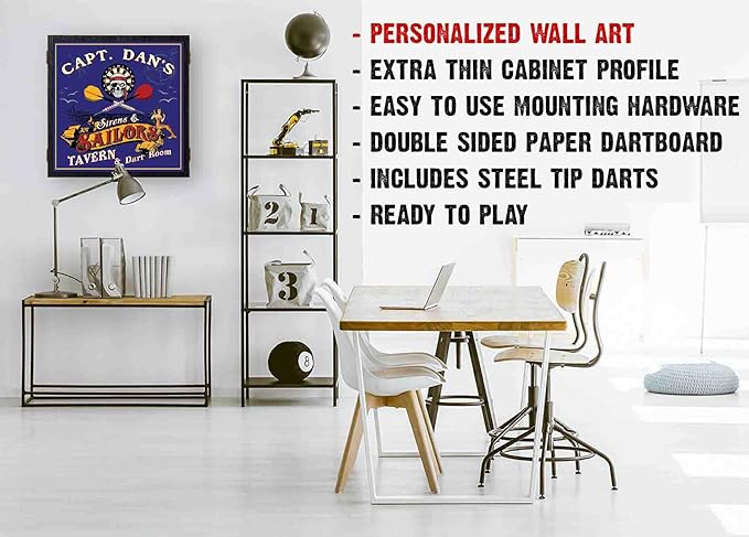 - PERSONALIZED Man Cave Decor & Game Set – Add your name, favorite phrase and special year to create a one-of-a-kind dartboard cabinet that doubles as functional wall decor for your mancave, home bar, games room or garage wall.