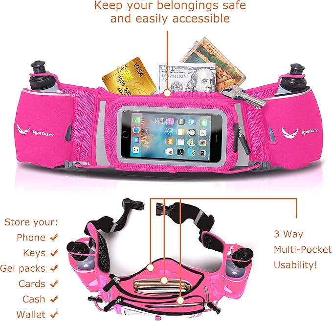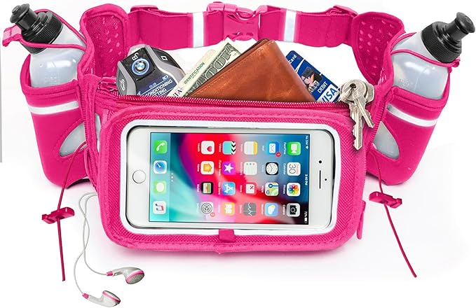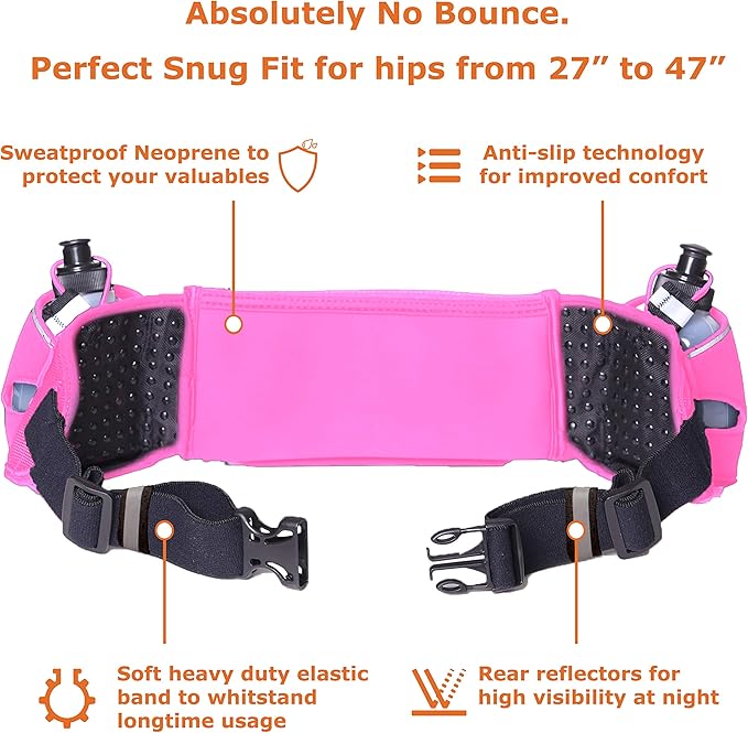 - ✔️ HYDRATION BOTTLES INCLUDED: Stay hydrated on the go – This pink dual-pocket hydration belt helps you get the most out of every walk, run, hike, or journey. Two BPA-free bottles provide 20 ounces of your favorite beverage, ensuring you never run dry.