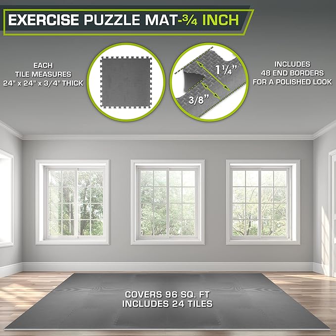 ProsourceFit Extra Thick Puzzle Exercise Mat, EVA Foam Interlocking Tiles for Protective, Cushioned Workout Flooring for Home and Gym Equipment, Grey - 3/4 inch - 96 Sq Ft - 24 Tiles