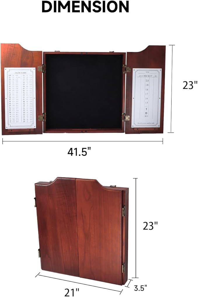 - Size: The dart cabinet dimensions when opened are 41.5" L x 23" W x 3.5" D; and the closed dimensions are 23" L x 21" W x 3.5" D