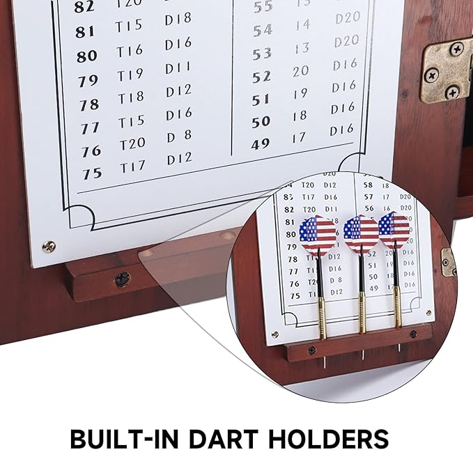 - Scoreboard & Out-Chalk: The dartboard cabinet has a white dry-erase scoreboard and a dart out chart inside of the doors with a smooth surface which allows for easy writing and erasing; it also has built-in slots for the storage of your darts on the inside of the cabinet doors; the cabinet backboard has black felt