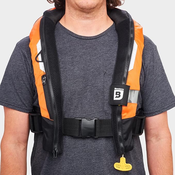 - SAFE AND SECURE: Bluestorm Gear's quick burst zipper technology keeps the life jacket secure during heavy fishing, boating, sailing, angling or water activities, yet opens rapidly when inflated.