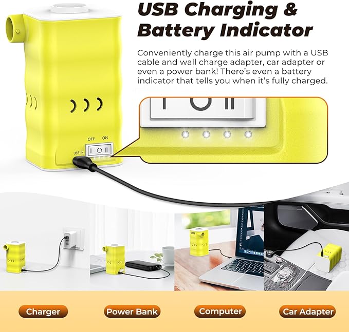 - Wide Application: Swimming pools, inflatable beds or boats, ski or swimming rings, and more. this rechargeable air pump is the perfect inflation and deflation combination.