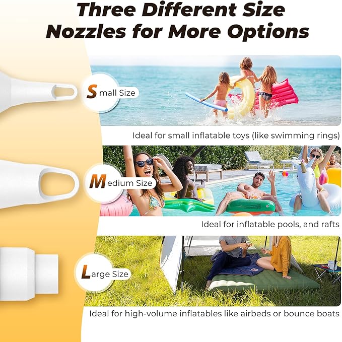 - 3 Sizes of Nozzles: Each electric air pump comes with 3 nozzle sizes for the exact fit! Inflating and deflating items, big or small, is now a breeze.
