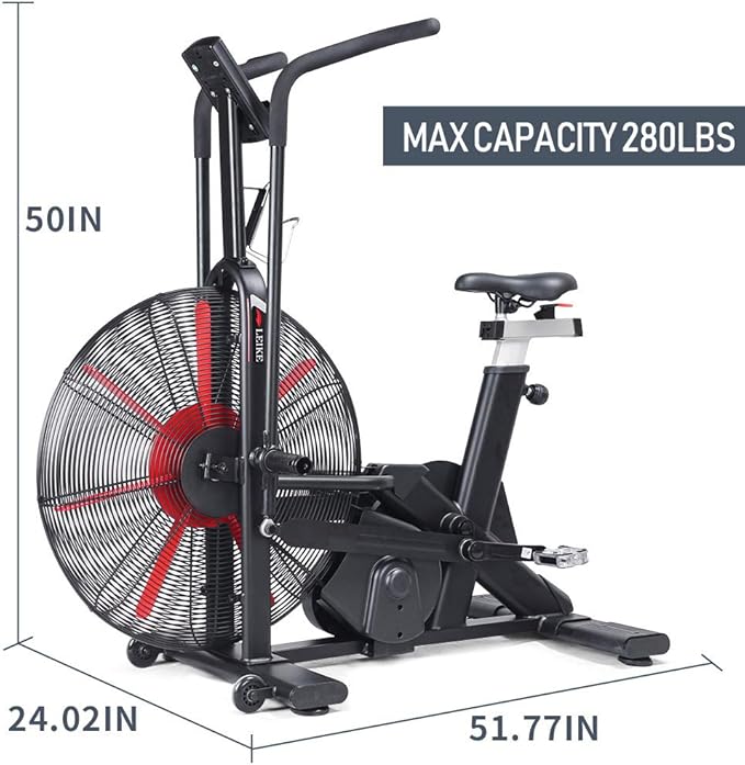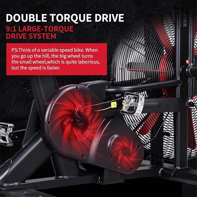 - 【UNIQUE AIR RESISTANCE SYSTEM】- Unlimited Resistance for upper and lower body extremities based on Air Resistance;The harder you push,the more resistance you’ll feel.Place your feet on the bike pegs to work the upper body.Experience smooth movement on the air bike with the joint chain and belt drive mechanism. Get a complete Cross-Fit Workout.