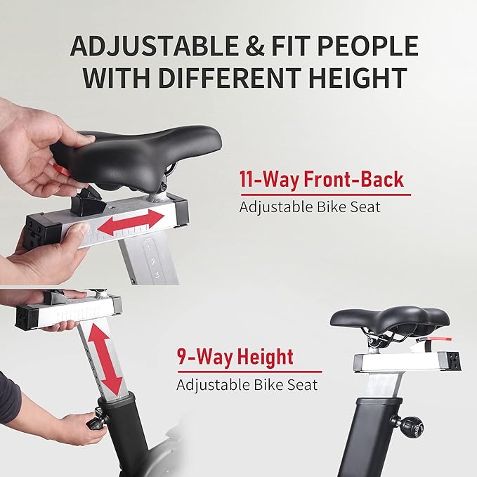 - 【VERSATILE & ADJUSTABLE SEAT SUITABLE FOR ANYONE】- This stationary bike is made with heavy duty steel,which weights 119LB equals 2 normal exercise bike.And can support up to 280LB. The seat and handlebar can also be adjusted to more closely approximate your situation.