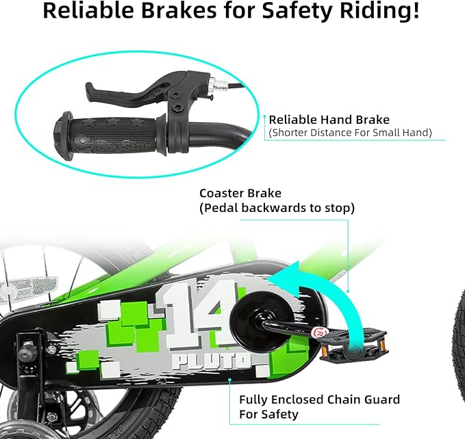 - DESIGN FOR KIDS - 1.This kids bike comes with flash training wheel, basket and water bottle for early rider. 2.Quick release seat simplify the height adjustment. 3.Saddle with holder to learn riding when the training wheel is off. 4. Foot brake and handbrake easy to provide phenomenal stopping power when needed.