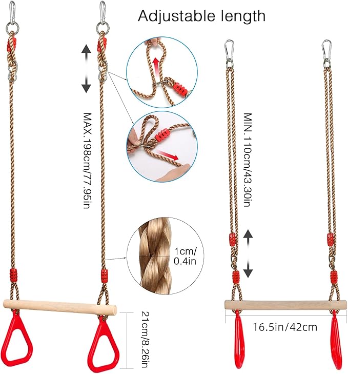 - ใ๐๐๐๐๐๐๐ ๐๐๐๐๐ ๐๐๐๐ใ- Strong wood loadable up to 352LB/ 160KG, with the super wear-resistant and sturdy PP ropes (up to 10 mm in diameter), Wooden Swing Bar: 17.72inche/45cm in length and 1.18inche/3cm in diameter.