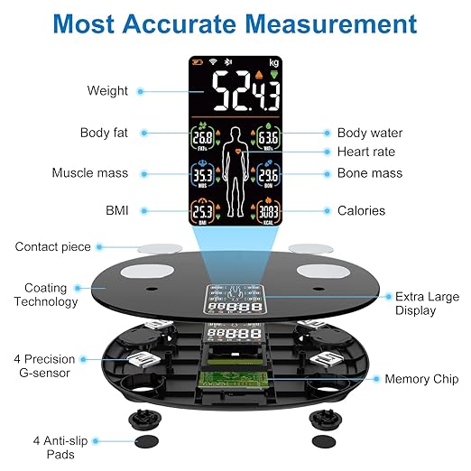- High-precision G-shaped sensor&Bigger screen: Uses the latest BIA (bio-impedance analysis) technology with a 6 mm high-quality VA tempered glass plate as well as high-precision G-shaped sensor. The bottom of the scale is completely wrapped, which makes the scale more stable and the measurement results more reliable. With a larger vibrant color display, all measurements are on one scale. This makes tracking your fitness journey convenient and enjoyable