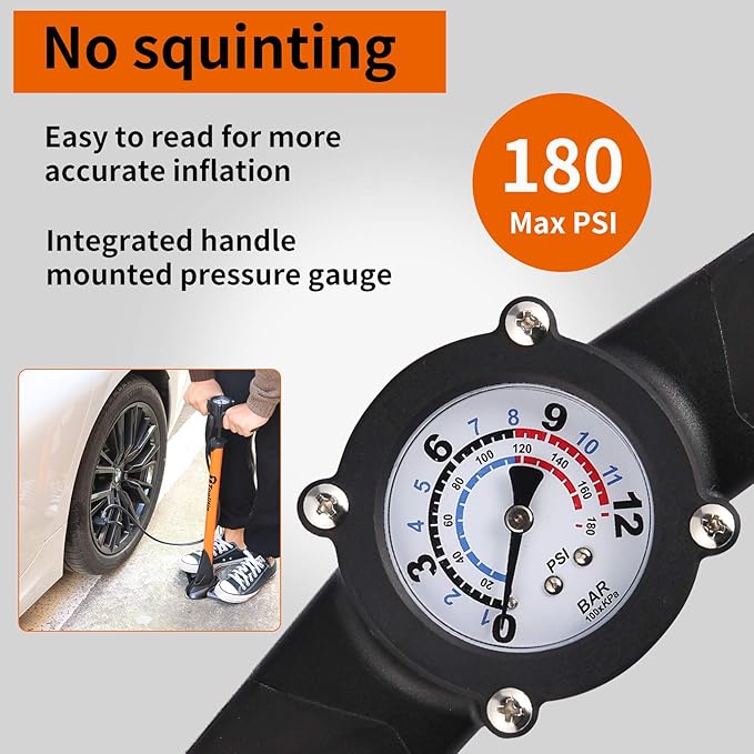 - Precision High Pressure 180 PSI: The ours pressure of our bicycle pump with gauge can reach to 12 Bar/180 PSI.You can inflate faster and easier than the pressure of 160PSI of similar pumps.More convenient for your daily use