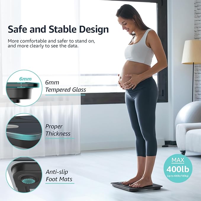 - 13 Essential Body Composition - The smart scale not only shows weight but also BMI, body fat, subcutaneous fat, body water, protein, BMR, body age etc., by electrical Bio-Impedance Measurement Technology. The data will sync to the app when your phone and scale connect successfully. It makes you know more data clearly about your body in time and track progress easily on your phone.