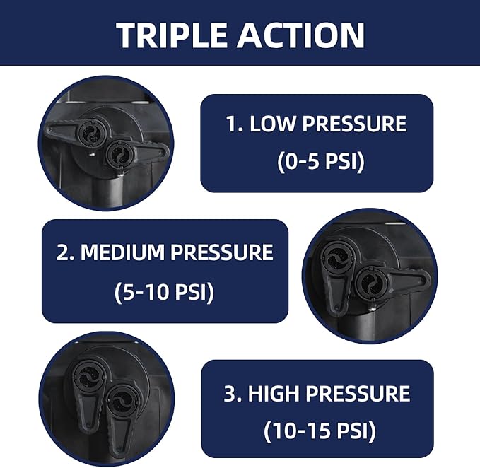 - 【Advanced Triple Action】Take advantage of the innovative triple action design of our inflatable paddle board pump. Unlike typical dual action pumps, it offers three modes tailored to low, medium, and high pressure conditions. The pressure gauge is conveniently located at the front cover, allowing easy pressure reading up to 29 psi. This versatility makes inflating your board easier and more efficient than ever before.