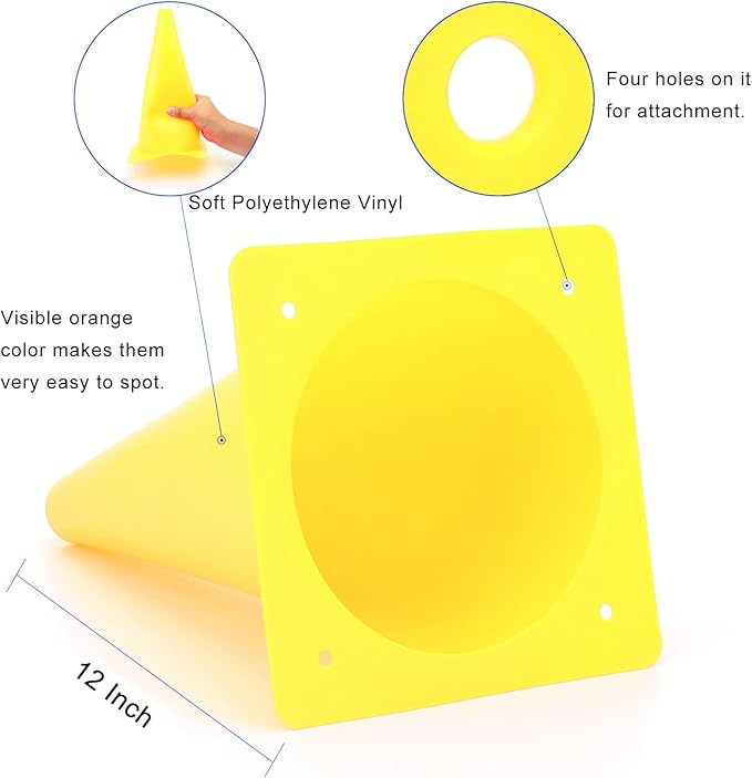 - Size - measures 12 inches in height, 6.7 inches in diameter. Four holes on safety cones for attachment, if it is a windy day, you do not need to worry it will blow all over the place.