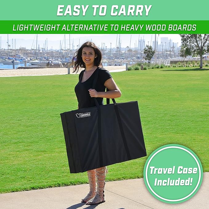 - COMPLETE CORNHOLE SET: Premium tailgate size 3 ft x 2 ft boards game set includes 8 all-weather regulation bean bags, travel carrying case, and rules